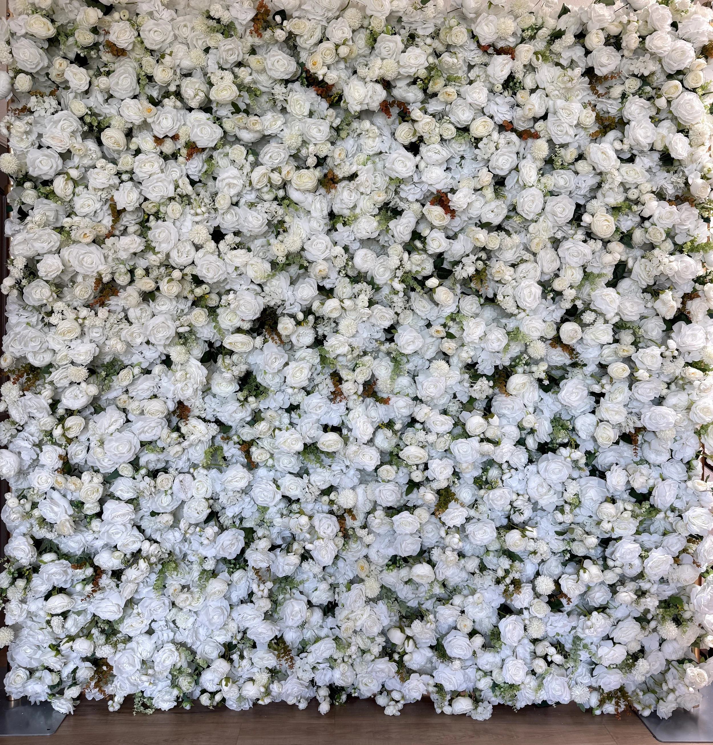 White and ivory roses, delicate white filler blooms, soft green fern.